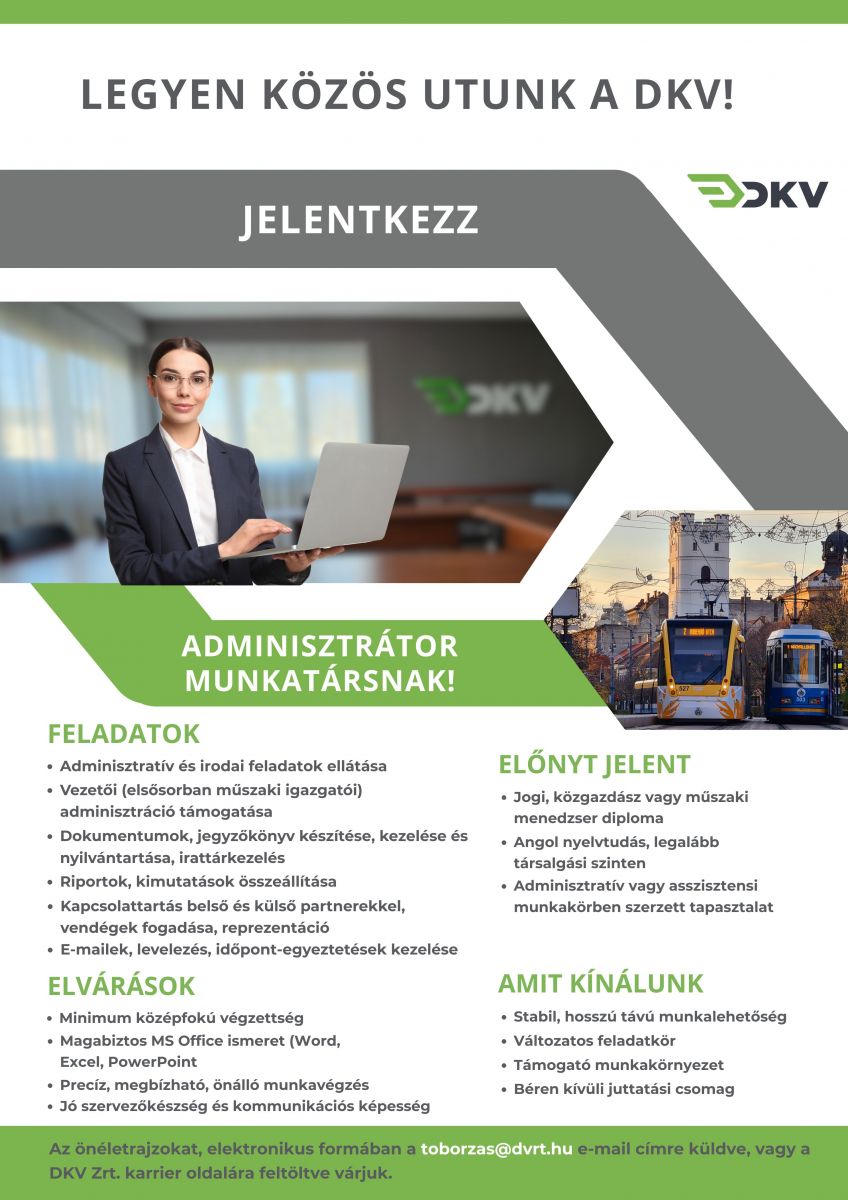 A DKV Zrt. adminisztrátor munkatársat keres, aki irodai feladatokkal támogatja a vezetők – elsősorban a műszaki igazgató – munkáját. A pozíció változatos feladatkört, stabil munkahelyet és támogató munkakörnyezetet kínál Debrecenben.